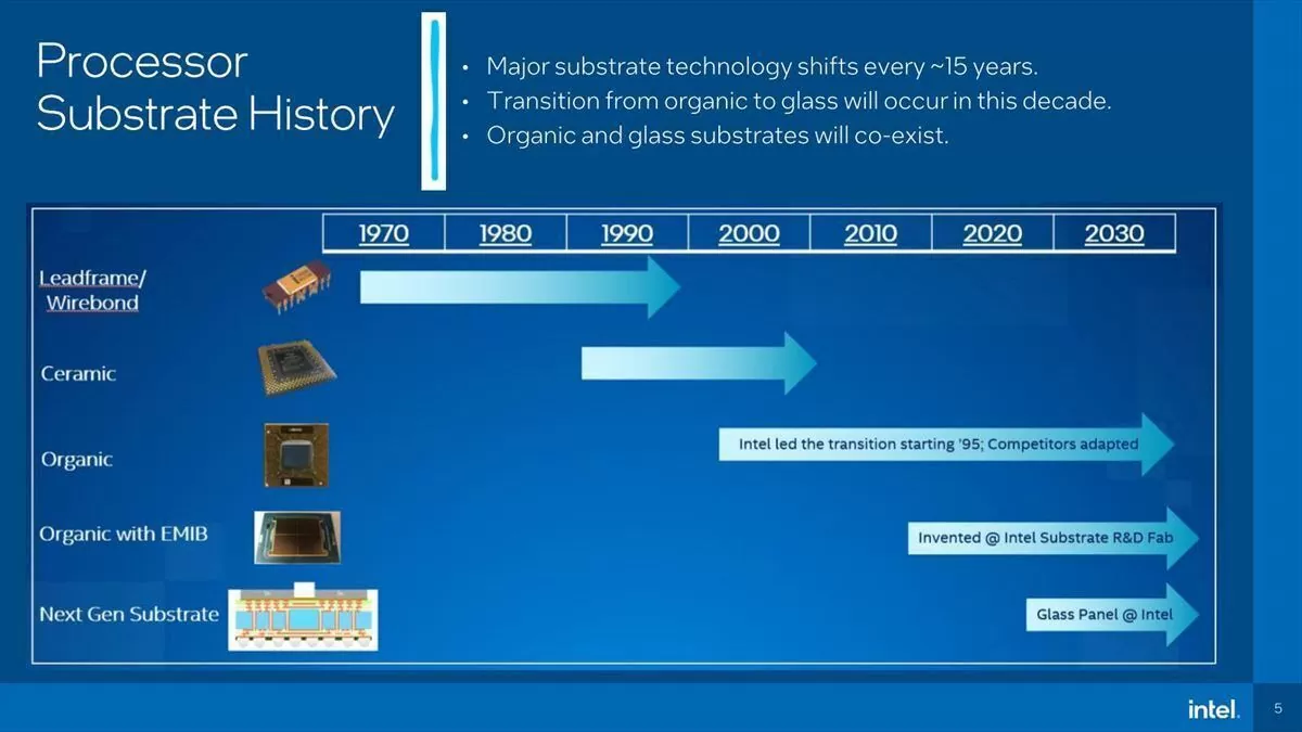 Intel表示,封裝的基板Substrate本來就是以15年左右為周期更新迭代的,現在的主流Organic Package是在2000年代初期出現的。這么算起來確實是到了該更新換代的時候了。(Photo07)