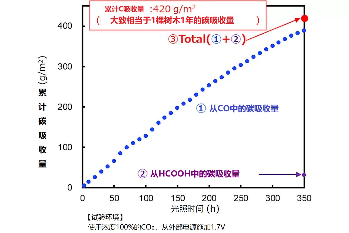 據(jù)稱,他們使用模擬陽光照射這種人工光合作用Device進行了氣相CO2轉(zhuǎn)換實驗,結(jié)果確認(rèn)連續(xù)350小時里CO2轉(zhuǎn)換成了COHCOOH。根據(jù)生成的COHCOOH算出每單位面積的累計碳吸收量達到了420g/m2創(chuàng)造了使用半導(dǎo)體光觸媒進行人工光合作用連續(xù)運作350小時的世界最長紀(jì)錄。NTT還表示,此次驗證的碳吸收量,超過了1棵杉樹1㎡約1年所吸收的碳排量。